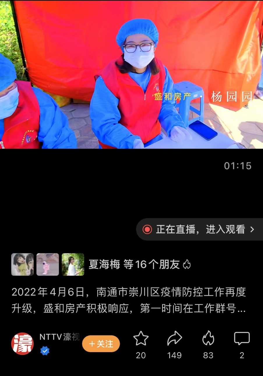 “我們公司72個人,都在社區(qū)幫忙做志愿者,也沒有什么特別想說的,就是希望南通疫情快點(diǎn)過去,大家能夠重返以前美好的生活?!边@是公司綜合管理部員工楊園園在紅星社區(qū)核酸檢測點(diǎn)做志愿服務(wù)時接受NTTV采訪所說的話。——沒有報酬,沒有獎勵,沒有“研究”和“商量”,他們自覺自愿。他們是黨員,是群眾;是領(lǐng)導(dǎo),是員工;是兒女,是父母;他們是盛和房產(chǎn)志愿者。